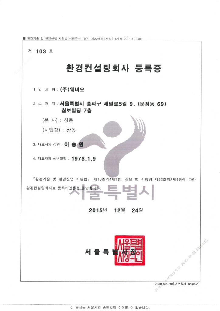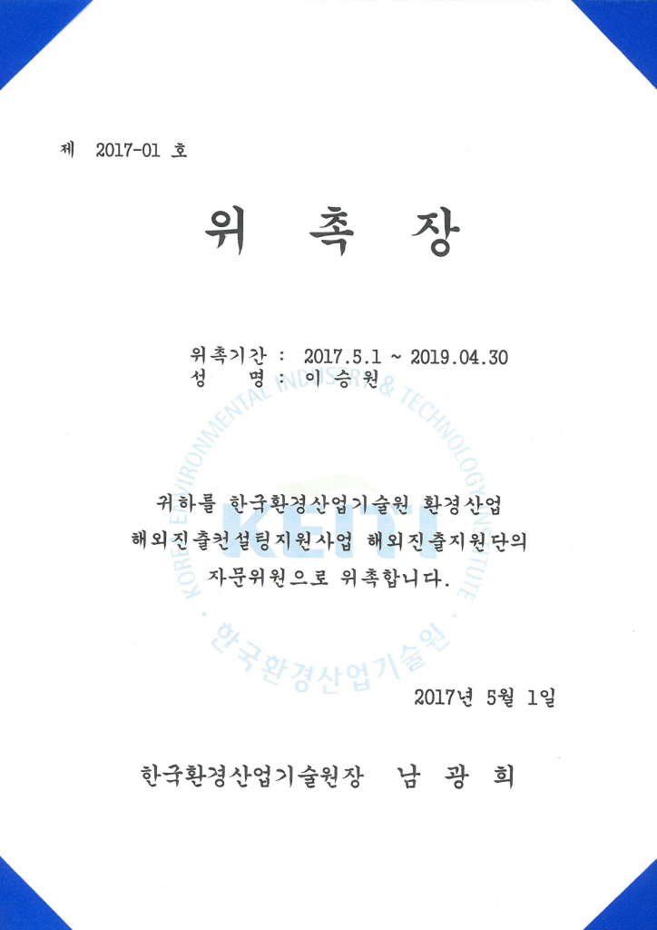 Appointment Letter of Advisory Expert of Korea Environmental Industry & Technology Institute