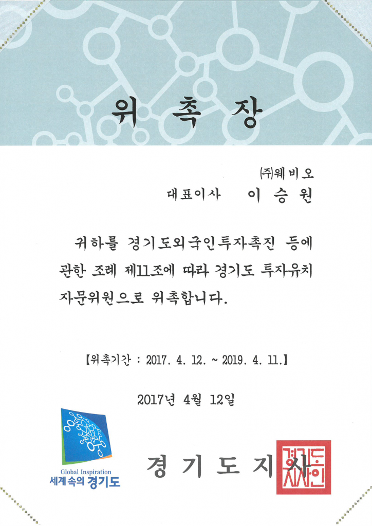 Appointment Letter of Gyeonggi-do Investment Promotion Advisory Committee