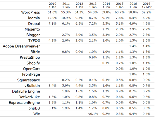 WordPress accounts for almost half of the world’s Internet Content Management System(CMS) websites, particularly in the blogging market. WordPress is a worldwide platform for website development that anyone can manage easily, with 59.2% (as of 2016) market share.