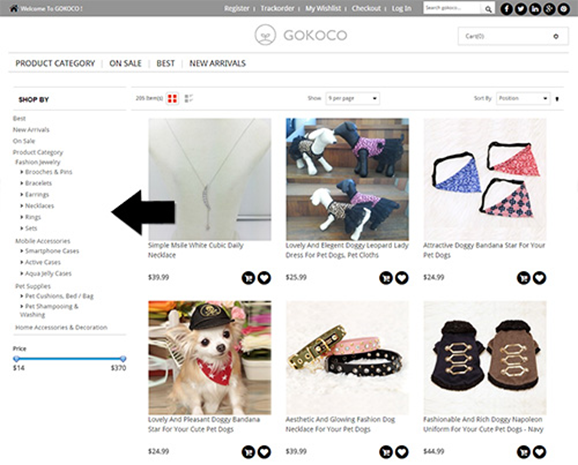 You will find examples of layered and faceted navigation on many — if not most — leading online retail sites. Gokoco, an online store, makes extensive use of layers and facets on its pages. In fact, if you look at the URL for a typical Gokoco product category page, you will even see references to these facets. Here’s an example: