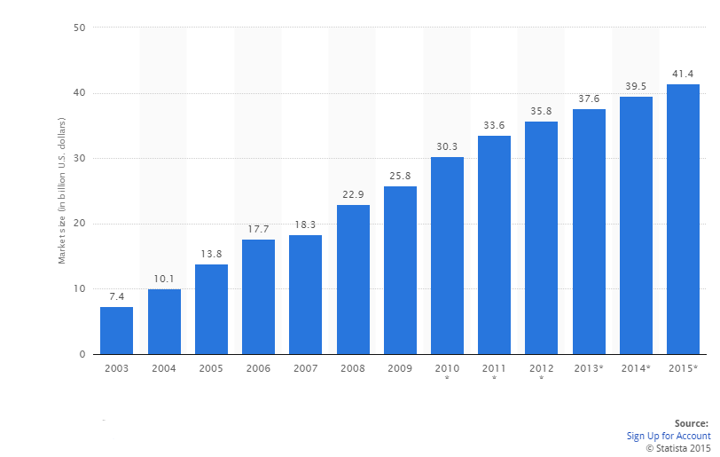 Online gaming or gambling is when you wager something of value, usually money, on the outcome of an event or game using the Internet. Online gaming includes activities such as poker, casinos (where people can play traditional casino games, like roulette or blackjack, but online), sports betting, bingo and lotteries. Of these, casino games and sports betting make up the largest share of the market. The market volume of online gaming was forecasted to reach 41.4 billion U.S. dollars in 2015, tripling in size since 2005.
