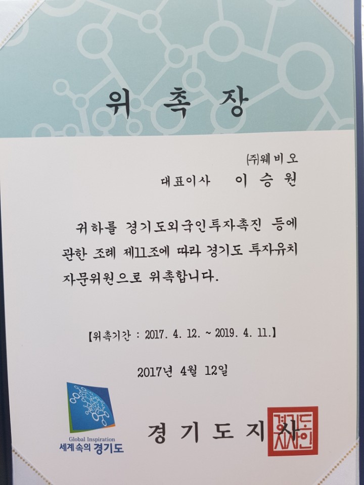 Mr. Obiio was appointed as an advisory committee member to Gyeonggi-do Investment Promotion Council in accordance with Article 11 of the Ordinance on Promotion of Foreign Investment in Gyeonggi Province.