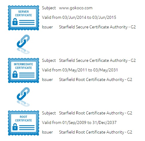 In the image below, you can see what is called the certificate chain. It connects your server certificate to your CA’s (in this case DigiCert’s) root certificate through a series of intermediate certificates.