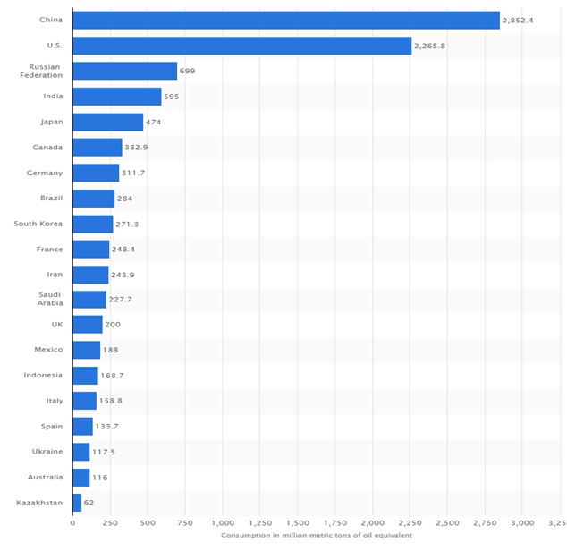 Top 20 countries in primary energy consumption in 2013 (in million metric tons of oil equivalent*)