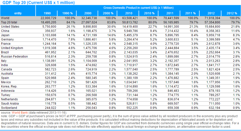 This entry gives the gross domestic product (GDP) or value of all final goods and services produced within a nation in a given year. A nation’s GDP at purchasing power parity (PPP) exchange rates is the sum value of all goods and services produced in the country valued at prices prevailing in the United States. This is the measure most economists prefer when looking at per-capita welfare and when comparing living conditions or use of resources across countries. The measure is difficult to compute, as a US dollar value has to be assigned to all goods and services in the country regardless of whether these goods and services have a direct equivalent in the United States (for example, the value of an ox-cart or non-US military equipment); as a result, PPP estimates for some countries are based on a small and sometimes different set of goods and services. In addition, many countries do not formally participate in the World Bank’s PPP project that calculates these measures, so the resulting GDP estimates for these countries may lack precision. For many developing countries, PPP-based GDP measures are multiples of the official exchange rate (OER) measure. The difference between the OER- and PPP-denominated GDP values for most of the weathly industrialized countries are generally much smaller. The chart below displays the Gross Domestic Product (GDP) of several different countries. (GDP) is also defined as the value of all final goods and services produced within a nation in a given year. (GDP) at Purchasing Power Parity (PPP) exchange rate is the sum value of all goods and services produced in the country. The most common measure is the US dollar. Economists prefer to use this measurement when looking at per-capita welfare and comparing living conditions or use of resources across countries. Using the US dollar as a measure is difficult. This measure must be applied to all goods and services in the country even if they do not have a direct equivalent in the United States (for example the value of an ox-cart). As a result (PPP) estimates for countries that have a different set of goods and services can become skewed. In addition, many countries do not formally participate in the Word Bank’s (PPP) project that calculates this data. The resulting (GDP) estimates for these countries can be inaccurate. Most developing countries (PPP) based (GDP) is based on multiples of their Official Exchange Rate (OER). Generally wealthy industrialized countries have a much smaller difference between the (OER) and (PPP) denominated (GDP) values. List if Top 20 Countries and GDP statistics from 1990 – 2012